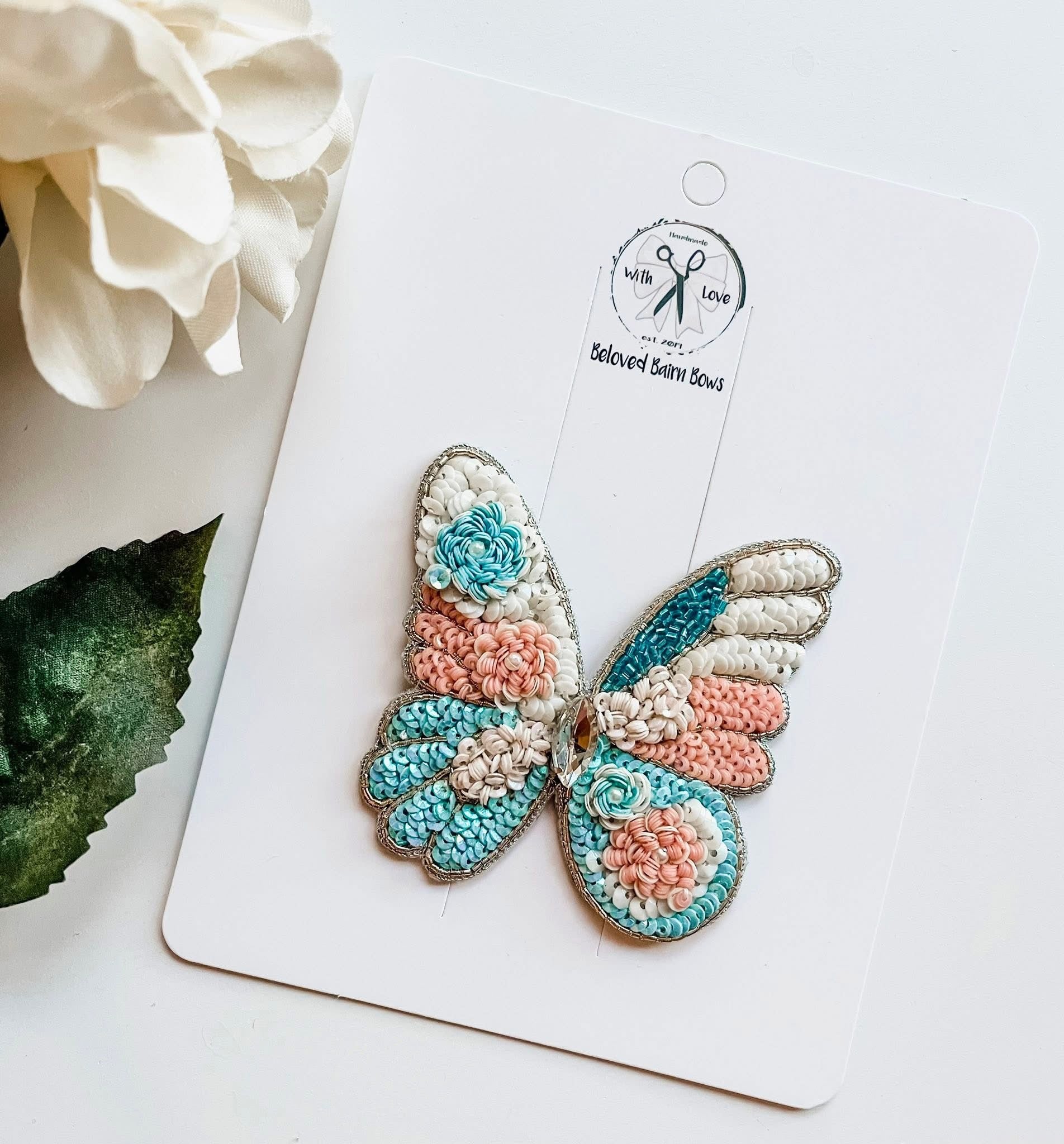 This listing is for an extra large hand beaded butterfly clip in a myriad of pastel colors. Measures approximately 3.5” wide and comes on snap clip for a firm all day hold.