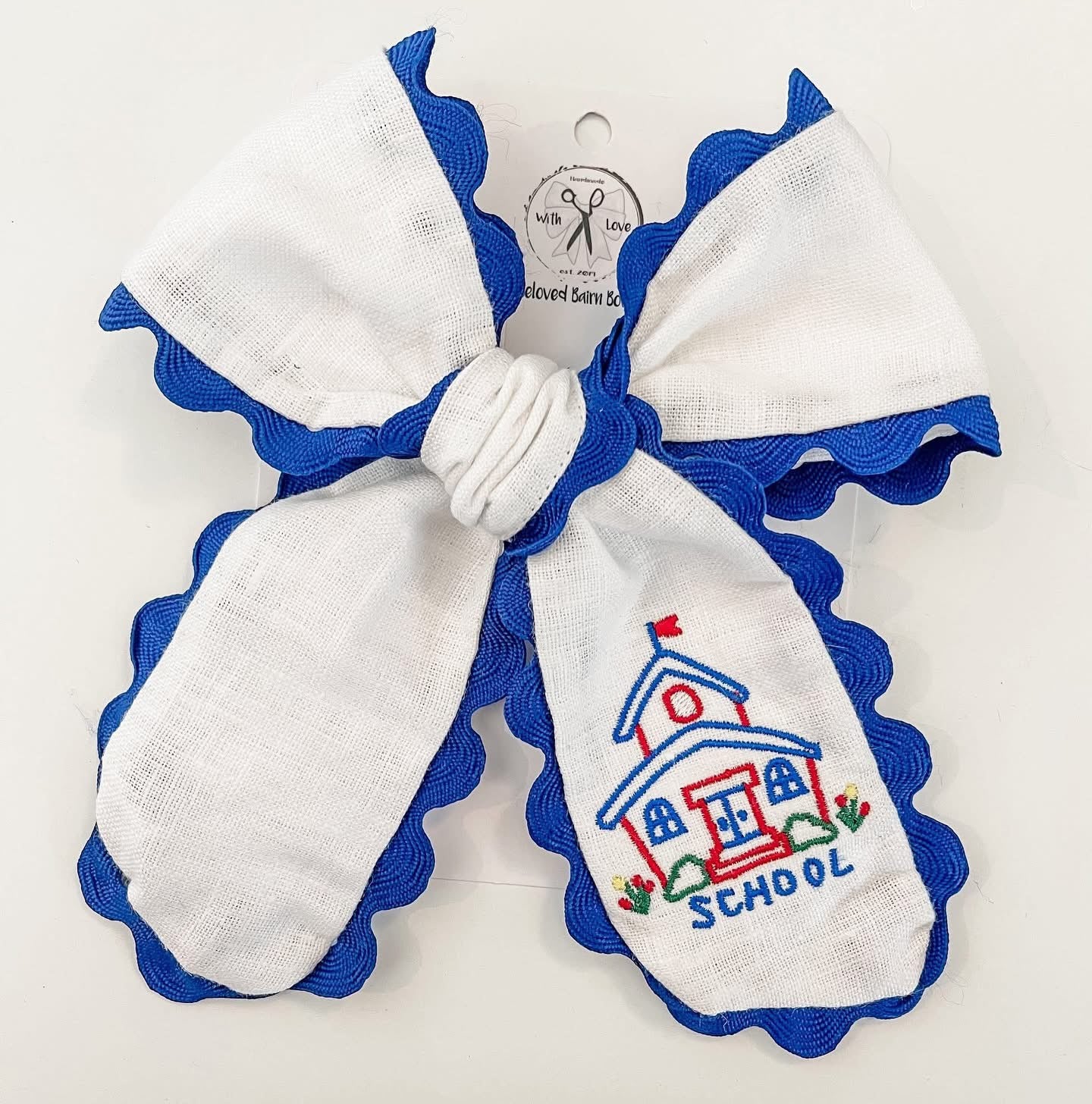 Bows measure 5” x 7” on white linen and finished with rikrak trim. Ships within 3 weeks.