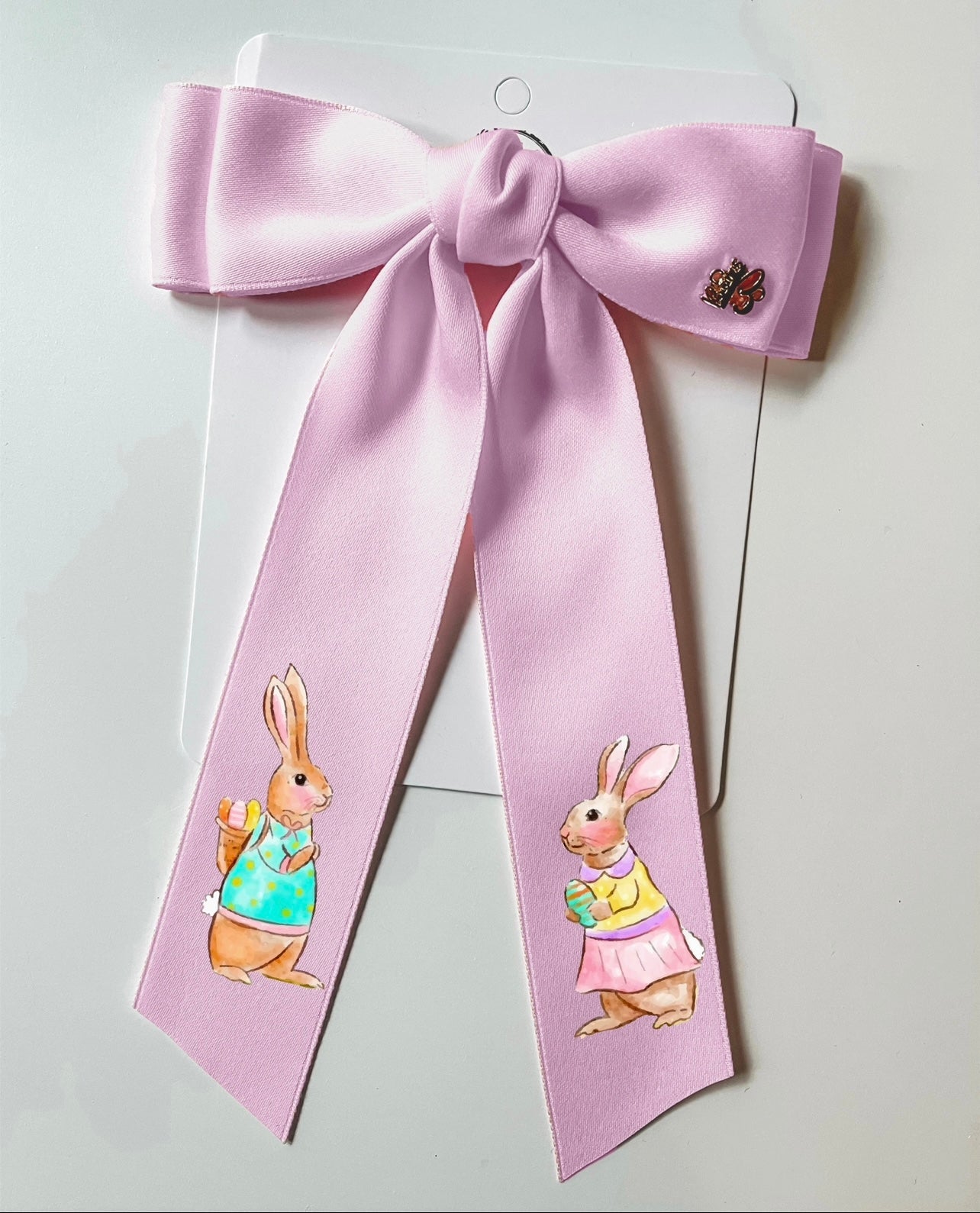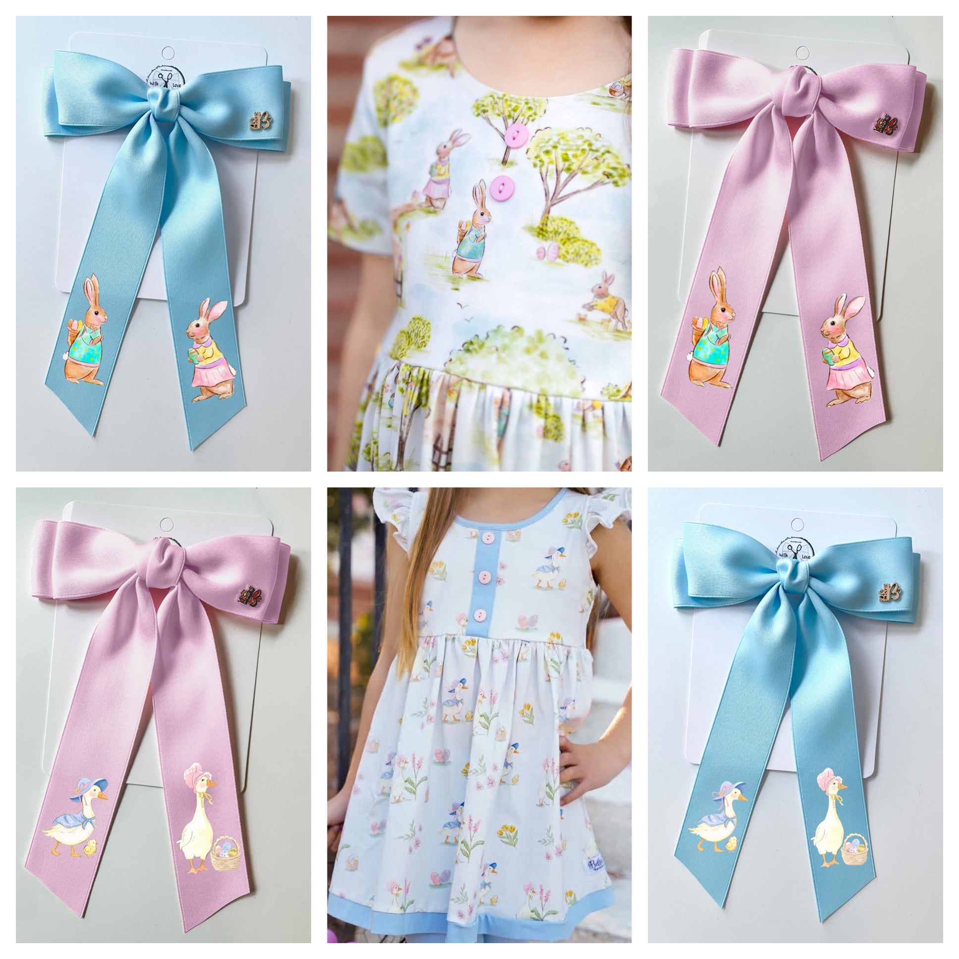Custom made to match Bella & Omi’s Easter 2025 release. Bows are made of high-quality double-sided satin, and measure approximately 5“ x 8“. Come on Metal alligator clip. Ships within 4 to 6 weeks.