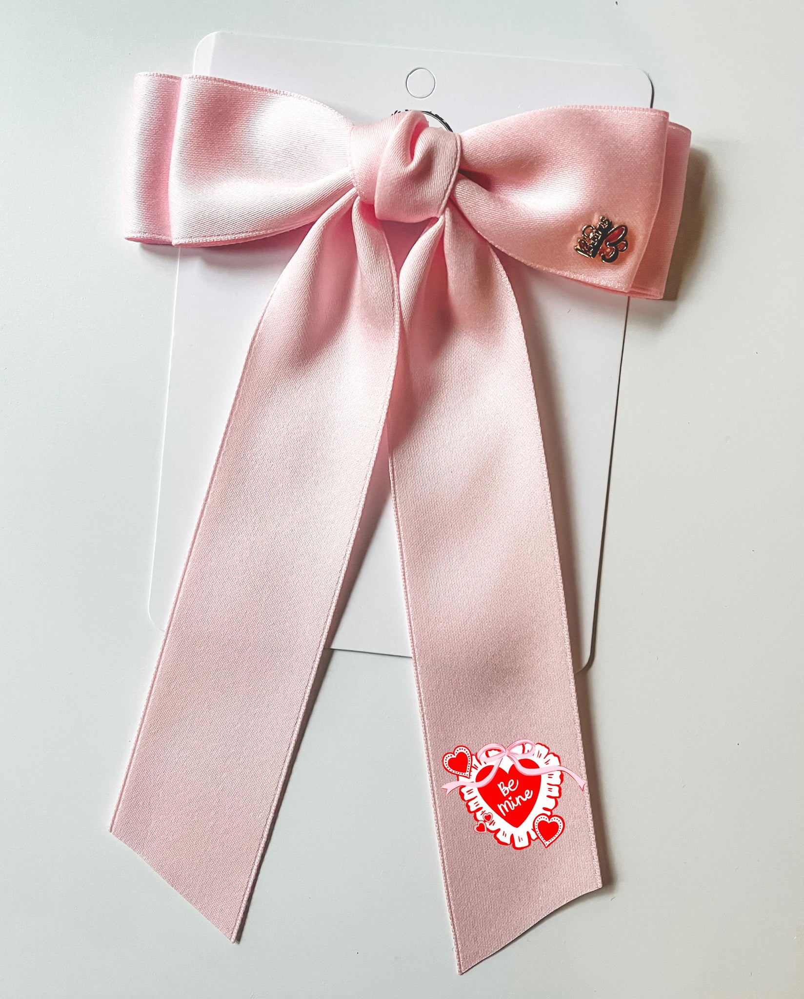 Bows are custom-made to exactly match Bella and Omi’s sweet Valentine release. Bows are made of high-quality double sided satin and measure approximately 5” x 8”. Come on metal alligator clip and finish with our gold plated charm. Image is heat pressed onto the satin.
