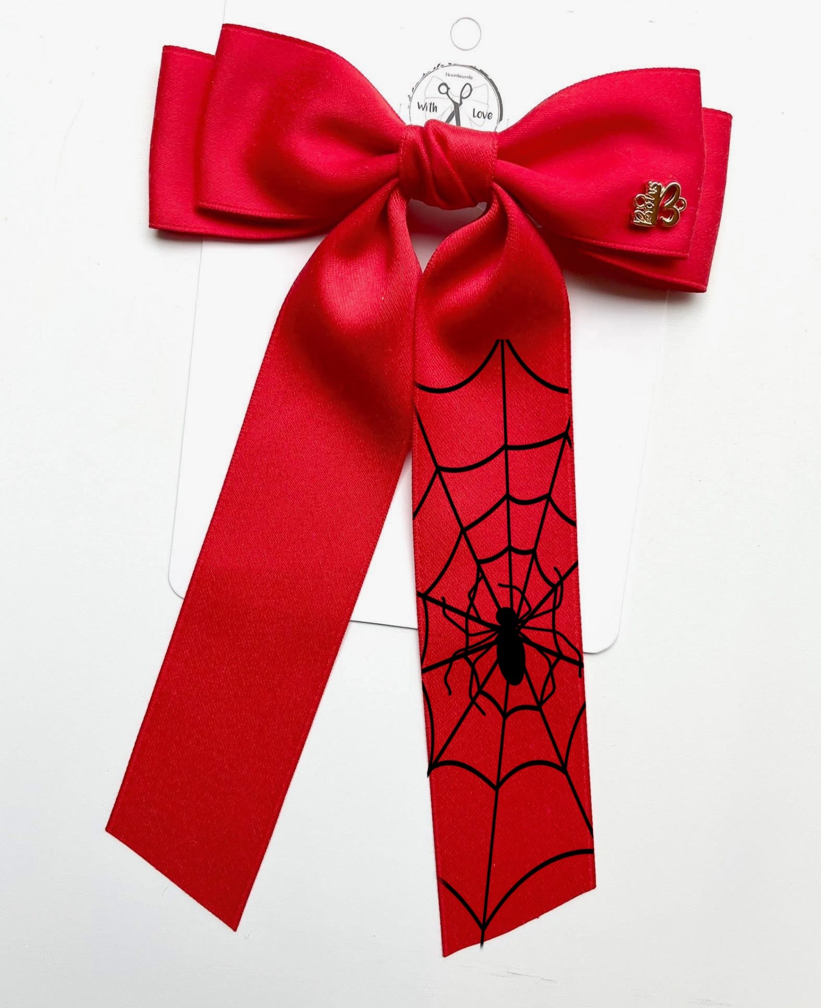 Our Ceci bows are made of high-quality double-sided satin ribbon with a final dimension of 5.5“ wide x 9“ long. Comes on metal alligator clip. Finished with custom spider and web SVG color printed designs and our gold plated charm.